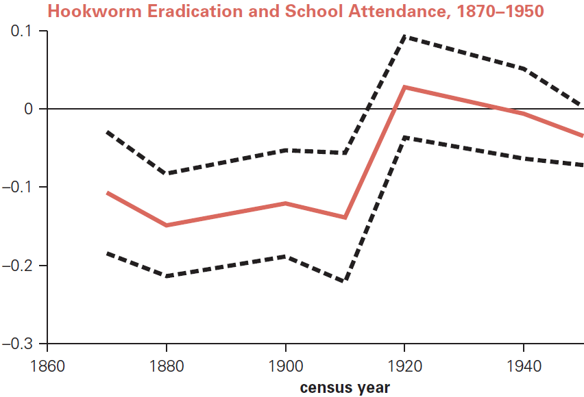 What does the red line mean exactly? For each census round with available data between 1870 and 1950, Bleakley (2007) computes the association within Southern counties between the school attendance rate of 8–16-year-olds and the hookworm infection rate as measured at the start of eradication, circa 1910.3The regressions for each census year control for the interactions of sex and race on the one hand and age on the other. They do not include the other Bleakley (2007) controls. Samples are restricted to eleven Southern states. The unit of observation is the State Economic Area, which is an aggregation of several counties. That the red line starts around –0.1 in 1870 means that on average, if a county’s child hookworm infection rate was 10 percentage points higher when measured around 1910, its school attendance rate in the 1870 census was 1 percentage point lower. More plainly, counties with more worms in kids had fewer kids in school. But between the 1910 and 1920 censuses, that bad-news association abruptly faded. As of 1920, a child in a historically high-hookworm county was no less likely to be in school. The black, dashed lines show confidence intervals for these census-by-census estimates—probably 95% confidence, but I cannot tell for sure.