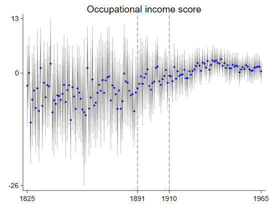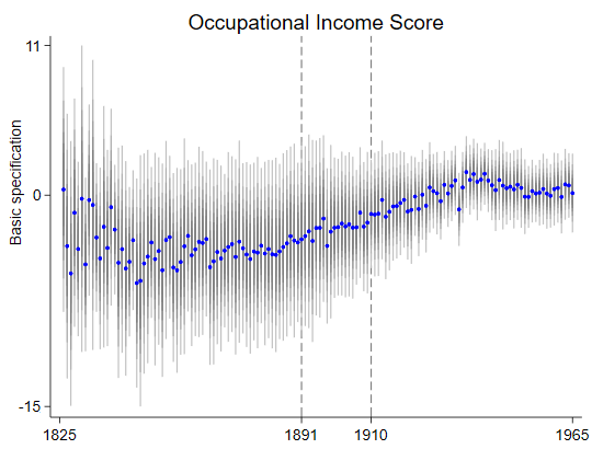 The Bleakley (2007) graph I will focus on draws together data from censuses as ancient as 1870 and modern as 1990. One problem with measuring impacts on income over this span is that not until 1940 did Census takers begin asking people how much money they made. For this reason, the IPUMS census database provides proxies for income that reach back farther. One is the occupational income score (OIS), which is, approximately speaking, the average income in 1950 associated with a person’s census-reported profession. Thus, if lawyers averaged $10,000 in income in 1950, then any self-described lawyer between 1870 and 1990 is taken to earn that much. The OIS is expressed in hundreds of dollars of 1950, and is an example of an index of “occupational standing.”