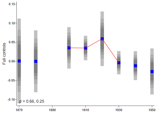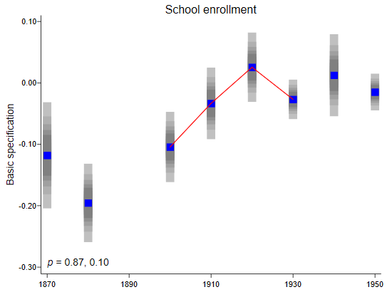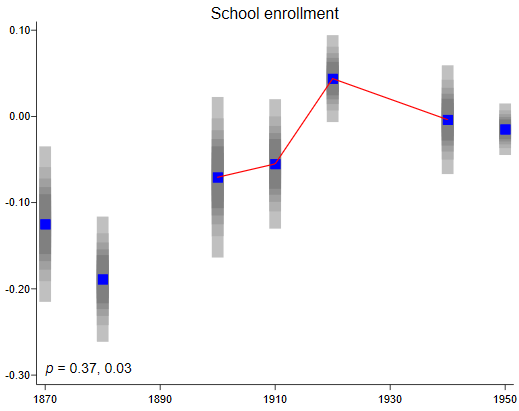 I think there is no one best way to answer that question. One approach that I took is depicted with the red lines in the reconstructed graph above, and in the p values in the bottom-left corner. I drew the red lines to connect the dots that surround the eradication campaign. I wanted to quantify how much the red contour bends upward in 1910 and downward in 1920—as in Bleakley’s graph—and with what statistical significance. That is: Suppose the education gains took place at a constant pace between 1900 and 1940 with no acceleration around the campaign in the early 1910s. (I would have substituted 1930 for 1940 were 1930 data available in this graph.) What is the chance that we would see as much bending in the red line as we do? The computer says that for the upward kink at 1910, the answer is 0.37, which is not very low. On the other hand, the deceleration around 1920 is quite hard to ascribe to pure chance, at p = 0.03. Still, the new graph casts doubt on the proposition that the campaign brought a big break with the past.