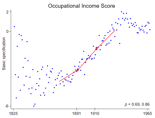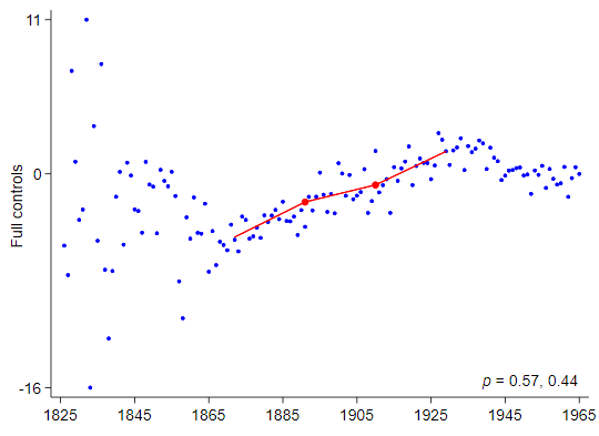 Since “not much” is muddy, I moved once again to formalize my interpretation. In analogy with my earlier graphs for schooling, I fit lines to the data points in the 19 years between 1891 and 1910, as well as to the 19 years on either side. Then I checked whether any bending in 1891 and 1910 is statistically significant. The final two graphs fit lines to the dots in the previous two. The dots in these next graphs are the same as in the previous two. It doesn’t look that way because I erased the grey confidence bars in order to expand the vertical scales.