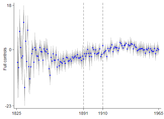 Below is my best reproduction of that graph. As before, I have plotted both the dots and their 95% confidence intervals. I have avoided superimposing the step-like contour the way Bleakley (2007) does because I worry that it tricks the eye into believing that the contour fits the data better than it really does. But I have marked the years when the contour kinks, 1891 and 1910: