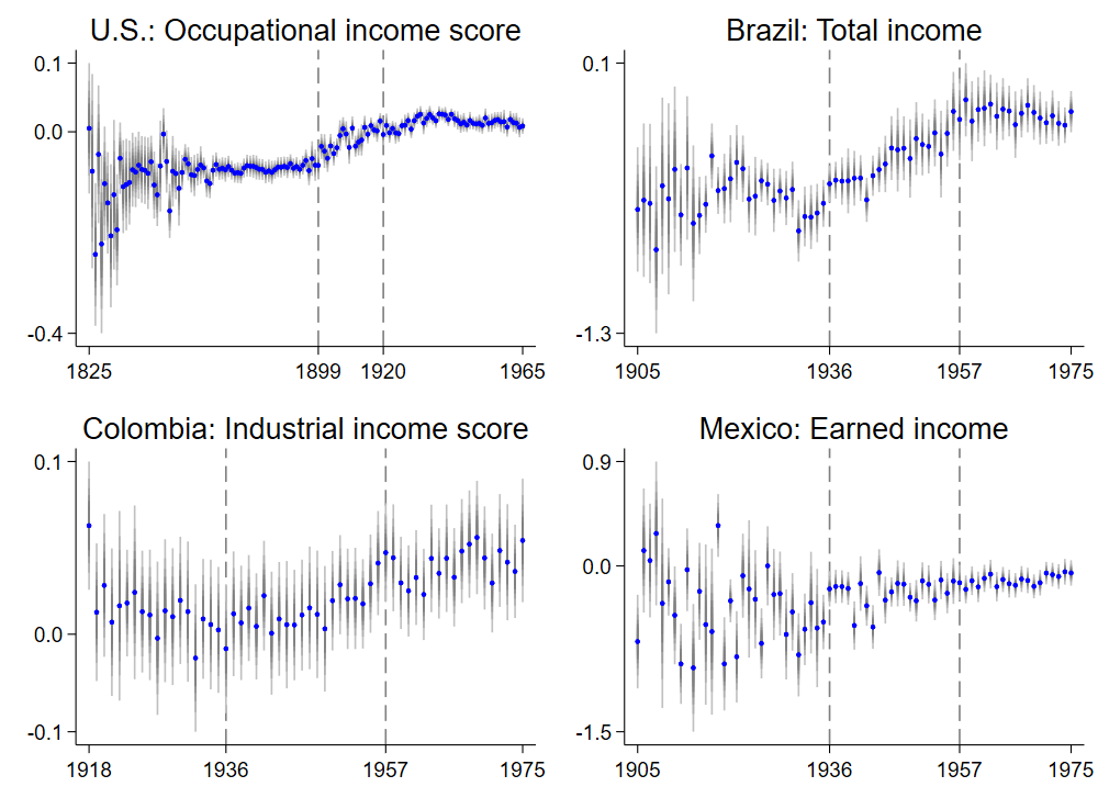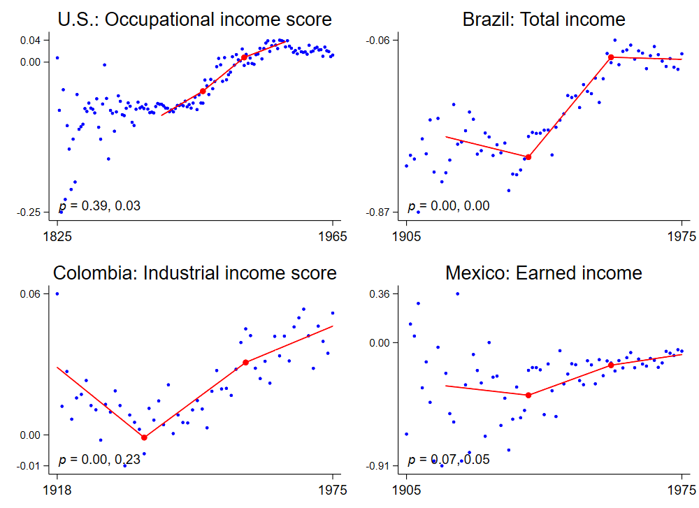 In Brazil, Colombia, and Mexico, this statistical test is fairly confident that red lines bend upward at the first kinks (p = 0.00 for Brazil and Colombia and 0.07 for Mexico). That is: in high-malaria areas, relative to low-malaria areas, as the first babies were born who could benefit in childhood from eradication, future incomes rose. The test is less confident for the United States, where the first allowed kink, in 1899, gets a high-ish p value of 0.39. However, the U.S. trend clearly bends upward—just earlier than predicted by the Bleakley (2010) theory. That might mean that the Bleakley (2010) theory is slightly wrong: maybe when it came to impacts on future earnings, malaria exposure continued to matter into one’s twenties, at least in the United States 100 years ago. Then, people born in the South even a bit before 1899 (the date of the first U.S. kink point) would have benefited from the eventual campaign against malaria; and that first kink should be moved to the left, where it would match the data better and produce a lower p value. Or perhaps that high p value of 0.39 signifies that the Bleakley (2010) model is completely wrong for the United States, and that forces other than malaria eradication drove the South’s catch-up on income.