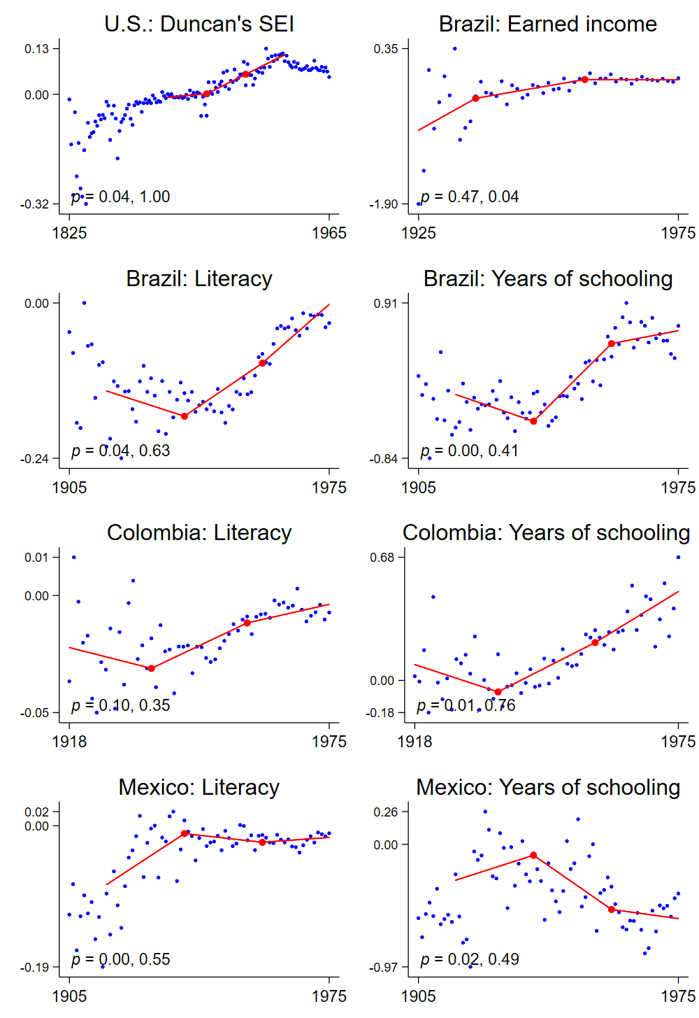 These figures hand us a mixed bag. In the United States, the trend on Duncan’s index appears to bend as predicted at the first allowed kink (p = 0.04) but not the second. Seemingly, relative income gains continued in the South well after malaria eradication could cause them. In Brazil, while relative progress on earned income slows when expected (second kink, p = 0.04), it does not appear to accelerate when expected (first kink), perhaps owing to small samples in the early years. In none of the Latin countries does relative progress on adult literacy or years of schooling slow with much statistical significance at the expected time (second kink points in bottom six graphs). The trend bends in all six at the first kink point, and with statistical significance—but the wrong way in Mexico.